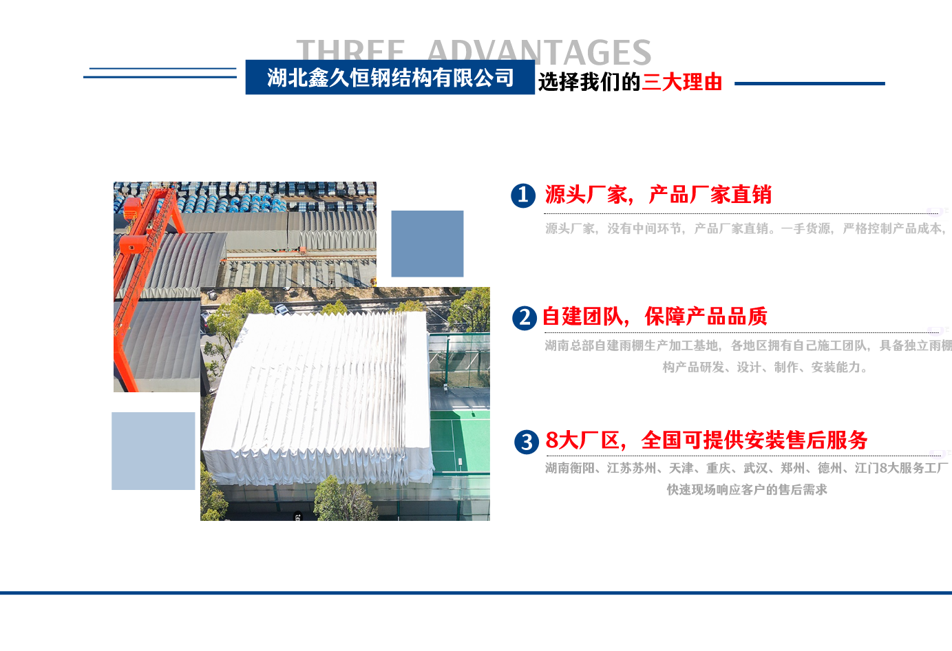 湖北鑫久恒鋼結(jié)構(gòu)有限公司是一家電動(dòng)雨棚、膜結(jié)構(gòu)車棚研發(fā),生產(chǎn)銷售,施工安裝于一體的專業(yè)鋼結(jié)構(gòu)科技公司,主要產(chǎn)品有伸縮雨棚,電動(dòng)雨棚,膜結(jié)構(gòu)車棚等。 湖南地區(qū)職員目前有80多人,占地面積20000平方米,廠房面積15600平方米,配備先進(jìn)的生產(chǎn)流水線,使每件品質(zhì)產(chǎn)品的堅(jiān)實(shí)基礎(chǔ)。 公司在蘇州、天津、重慶、武漢、德州、烏魯木齊、江門均設(shè)有服務(wù)工廠,總?cè)藛T共300多人,擁有專業(yè)的技術(shù)團(tuán)隊(duì),配備先進(jìn)的設(shè)備和流水線生產(chǎn),產(chǎn)能高,貨源充足,發(fā)貨速度快,服務(wù)區(qū)域廣。 移動(dòng)伸縮棚適用于通道臨時(shí)倉儲、戶外運(yùn)動(dòng)遮陽、污水池遮蓋、能源交通、熱力化工、礦山、船舶制造及市政建設(shè)、物流、碼頭等領(lǐng)域的構(gòu)件制作加工,成品半成品存放、倉庫、野外儀器設(shè)備操作用房等。尤其是對工廠發(fā)貨、倉儲臨時(shí)遮雨防嗮,梅雨期較長、建設(shè)周期較短的工程施工等特別適用。還可根據(jù)用戶需求量身定制、適合企業(yè)所需不同款式的產(chǎn)品。 我公司堅(jiān)持“誠信社會為本,客戶滿意為榮”的經(jīng)營理念,做到質(zhì)量把控,嚴(yán)格管理,精益求精,恪守承諾。使鑫久恒逐步走向成熟,其系統(tǒng)化、專業(yè)化日趨完善。以專業(yè)的技術(shù)、科學(xué)的管理,更高的產(chǎn)品質(zhì)量,優(yōu)良的企業(yè)信譽(yù),真誠的客戶服務(wù),靈活多樣的經(jīng)營方式和務(wù)實(shí)創(chuàng)新的企業(yè)精神愿與社會各界攜手合作,為推動(dòng)智能鋼結(jié)構(gòu)建筑事業(yè)的發(fā)展而不斷努力。...